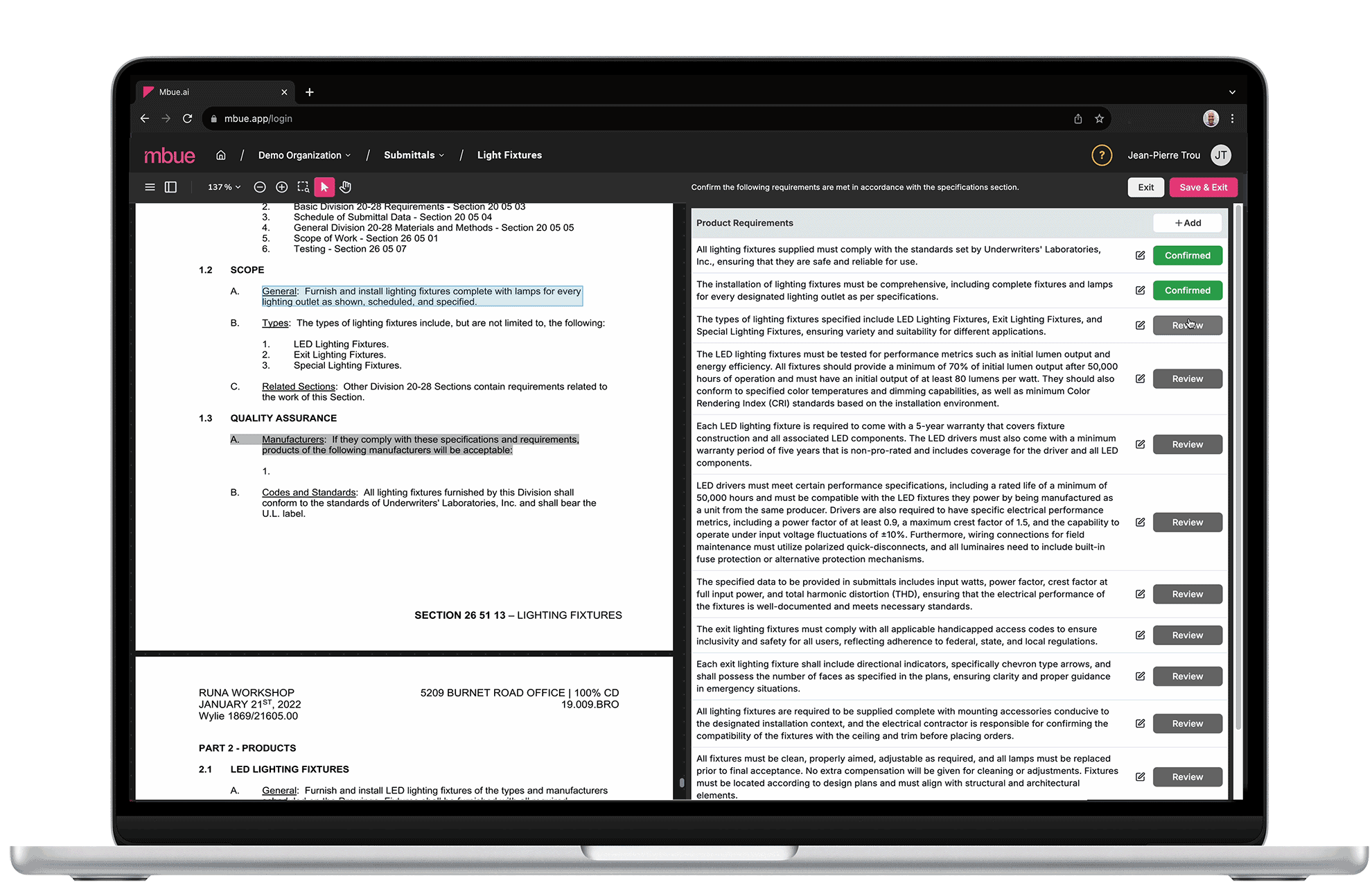 Start automating your most tedious workflows with mbue. Instantly review drawings for changes and generate fully compliant submittals— so you can move faster, reduce risk, and focus on the work that matters most.