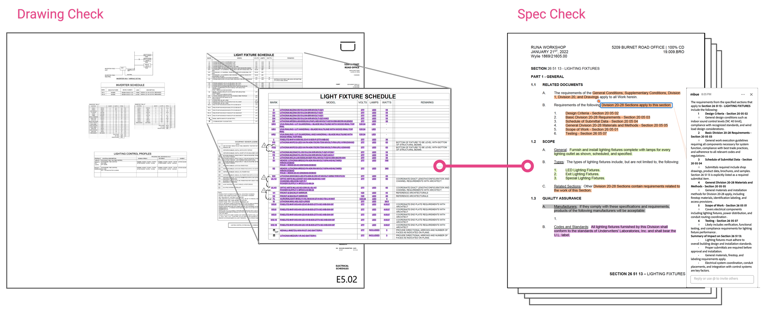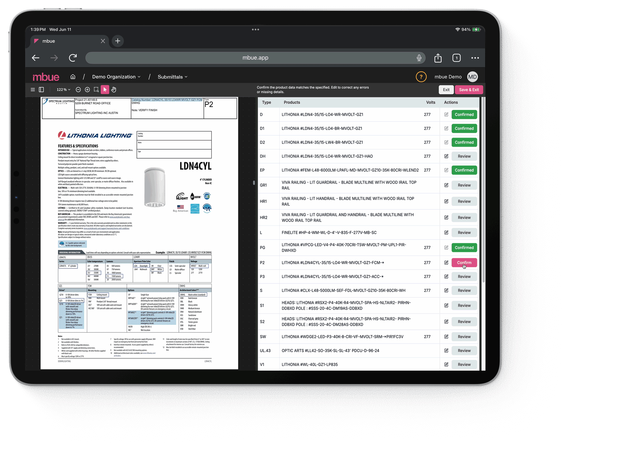 mbue Submittals analyzes drawings and specifications, including all electrical schedules, and automatically extracts the required product information to generate fully compliant product data submittals for light fixtures, switchgear, panels, devices, and other materials.